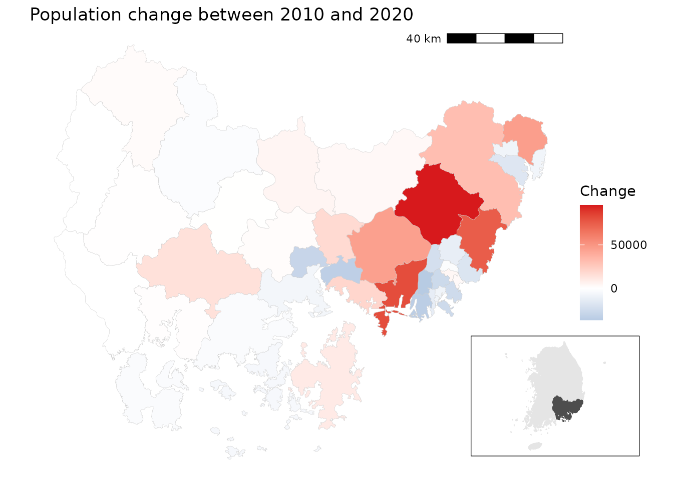 - 인구 증감을 보여주는 발산형 색상 지도와, 해당 지역을 강조한 대한민국 인셋 지도를 만듭니다.