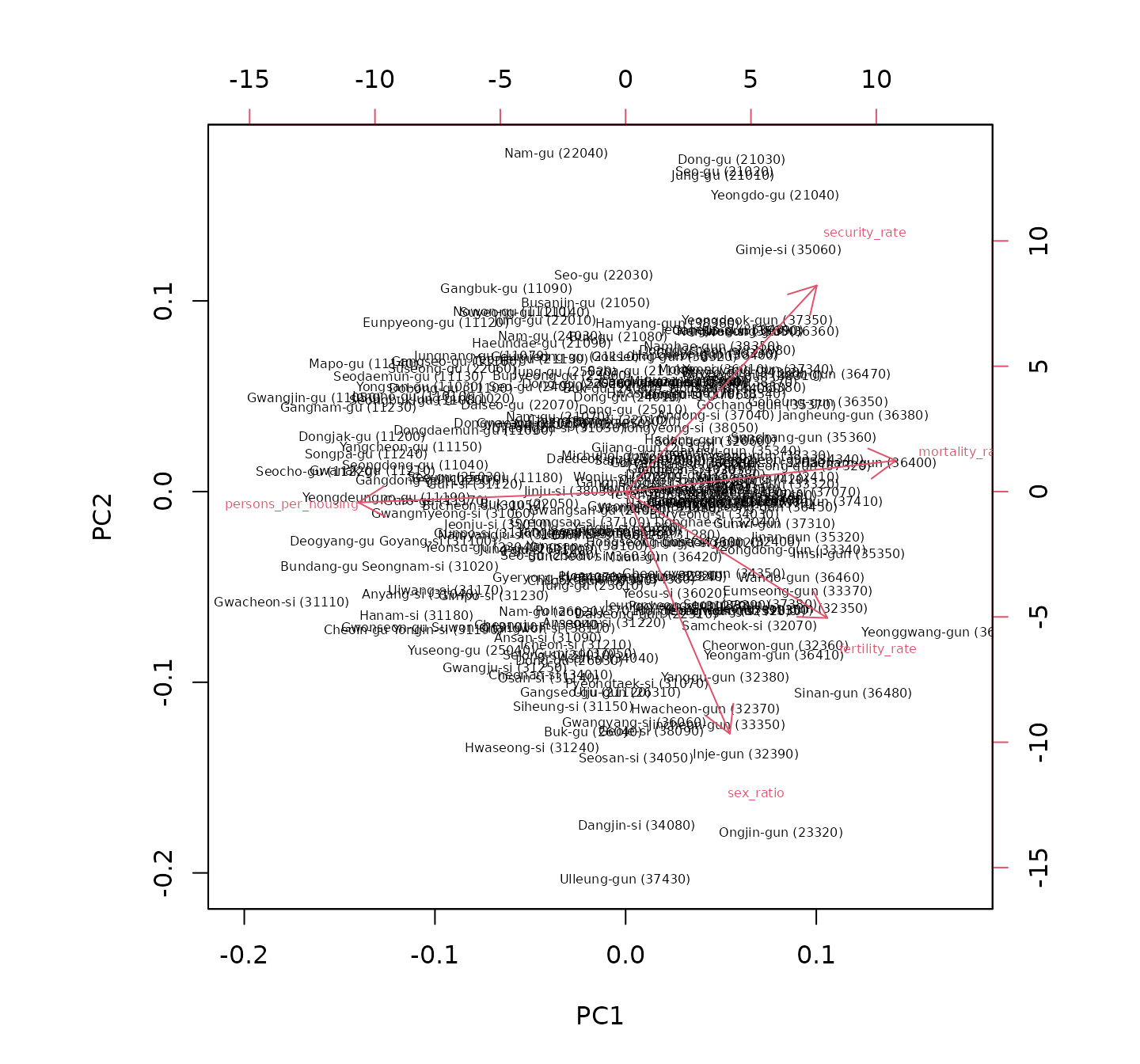 첫 번째와 두 번째 주성분을 이용해서 이분도를 그려봅니다. 이 그림은 각 시군구를 점으로 표시하고, 개별 변수를 화살표로 나타내 주성분분석에 사용된 여러 변수들 간의 관계를 이해하는 데 도움을 줍니다. 또한 그 관계가 지역별로 어떻게 다른지도 파악할 수 있습니다. 해석의 편의를 위해서 각 시군구의 이름과 코드를 라벨로 표시합니다.