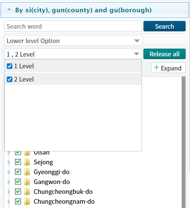기본 화면에는 선택된 변수 세트 또는 시군구 지역이 표시됩니다. 툴바의 가장 오른쪽에 있는 “조회설정” 버튼을 클릭하여 선택을 사용자 정의할 수 있습니다. 사이드바가 나타나면 관심 변수, 연도 및 지역을 선택할 수 있습니다. 모든 시군구 지역을 선택하려면 “행정구역” 탭 아래의 “2단계 선택” 버튼을 클릭하십시오. 그러면 모든 시군구 지역의 체크박스가 활성화됩니다. “1단계 선택” 버튼은 시도(대도시/지방) 수준의 지역만 선택하며, 이는 대다수 데이터셋의 기본값입니다. 참고할 점은 세종시와 같은 일부 단일 구역 도시는 때때로 “2단계 선택” 아래에 나열되지 않을 수 있다는 것입니다. 이 경우 해당 지역의 상자를 수동으로 체크해야 합니다.