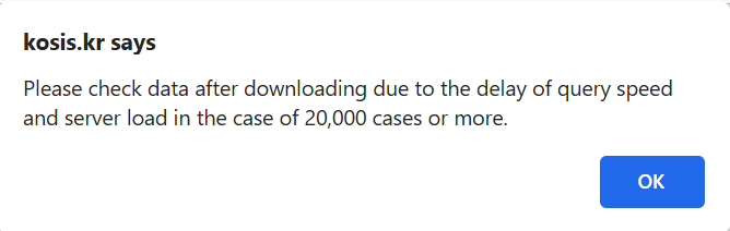 조합의 수가 너무 많으면 KOSIS 서버가 처리하기에 너무 큰 쿼리가 발생하여 KOSIS 설정에 의해 금지됩니다. 기본 설정은 한 쿼리 인스턴스당 20,000셀입니다. 아래 화면 캡처와 같은 오류 메시지가 나타날 수 있습니다.