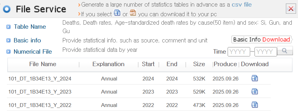 자주 사용되는 데이터셋은 빠른 접근을 위해 미리 생성되어 KOSIS 서버에 저장된 상태로 제공됩니다. 이 경우 팝업에 “통계표 파일 서비스”라는 추가 섹션이 표시되고 그 아래에 “바로가기” 버튼이 있습니다. 또 다른 팝업 창이 나타나 미리 생성된 파일에 대한 직접 다운로드 링크 목록을 제공합니다. 이 파일들은 일반적으로 레코드에 대한 보조 변수와 함께 연도별로 제공됩니다.